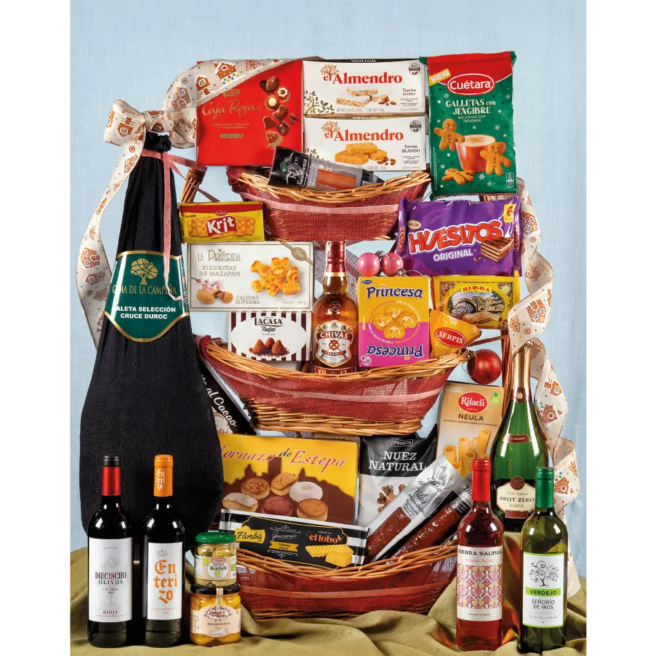 La Cesta Alegría es un lote de Navidad muy completo que incluye una paleta selección cruce duroc de 4–4,5 kg, embutidos ibéricos de bellota, una cuidada selección de vinos, cava, whisky Chivas Regal 12 años y un amplio surtido de dulces tradicionales. Presentada en cesta de mimbre natural y rebajada un 20%, es una opción ideal para regalar en Navidad y acertar seguro.