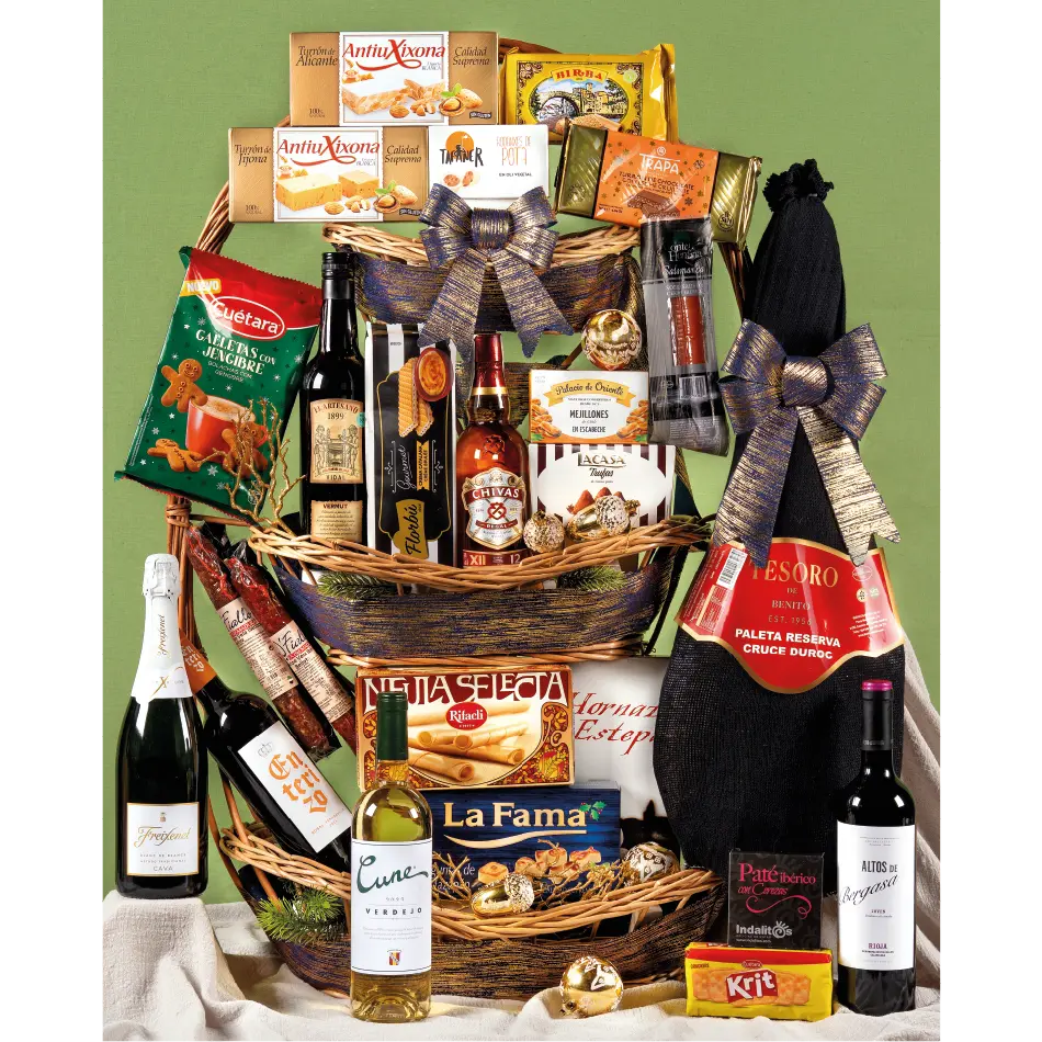 La Cesta Nadalia es un lote de Navidad muy completo que combina una paleta serrana reserva cruce duroc de 4–4,5 kg con embutidos ibéricos de bellota, una cuidada selección de vinos, cava Freixenet, vermouth artesano y un variado surtido de dulces tradicionales. Presentada en cesta de mimbre natural de tres pisos y rebajada un 20%, es una opción ideal para regalar en Navidad con una excelente relación calidad-precio.