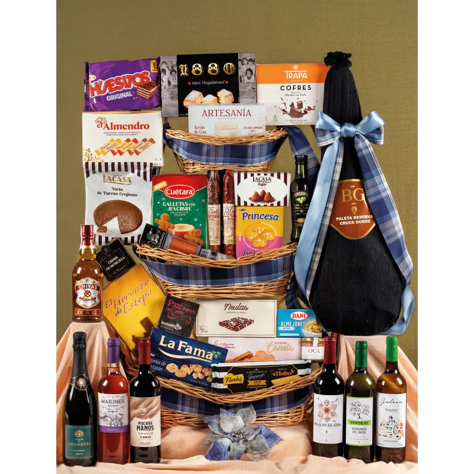 Una de las cestas más completas de la colección: jamón gran reserva, paleta Duroc, surtido ibérico, cavas, vinos D.O., dulces navideños y conservas selectas. Ideal para sorprender con un regalo navideño inolvidable, tanto en familia como en entorno empresarial. Presentación cuidada y gran formato.