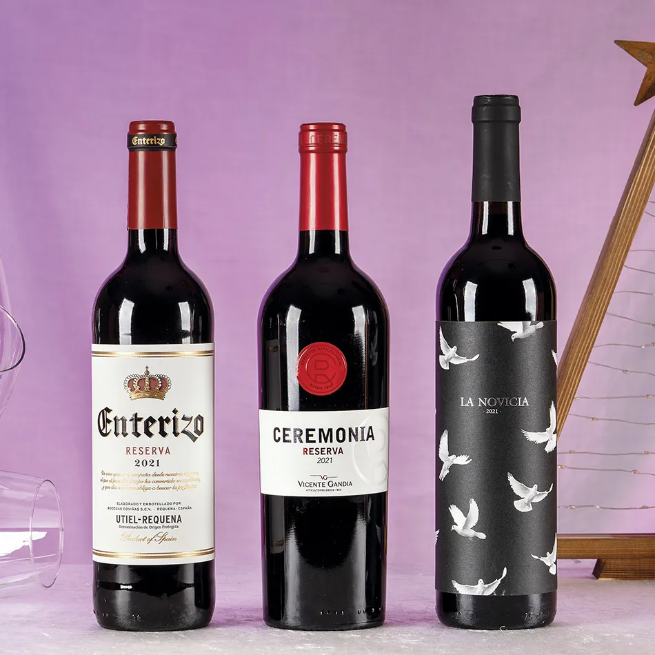 Destacan los tres tintos de D.O. Utiel-Requena: La Novicia (suave y frutal), Enterizo Reserva (con crianza equilibrada y toques especiados) y Ceremonia Reserva (estructura firme y matices tostados), perfectos para acompañar carnes y quesos curados.