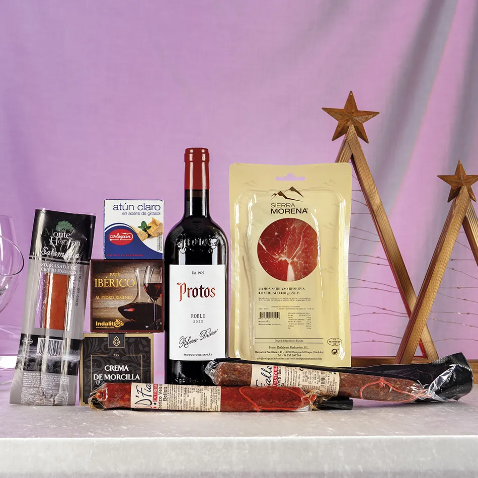Estuche 707 combina salchichón y chorizo ibéricos D’FIALLO, sobrasada Montehonfría, loncheado de jamón Sierra Morena y vino Protos Roble, complementados con cremas y conservas gourmet. Un pack pensado para brindar con elegancia y sabor auténtico. ¡Compra ahora y sorprende a tus invitados!